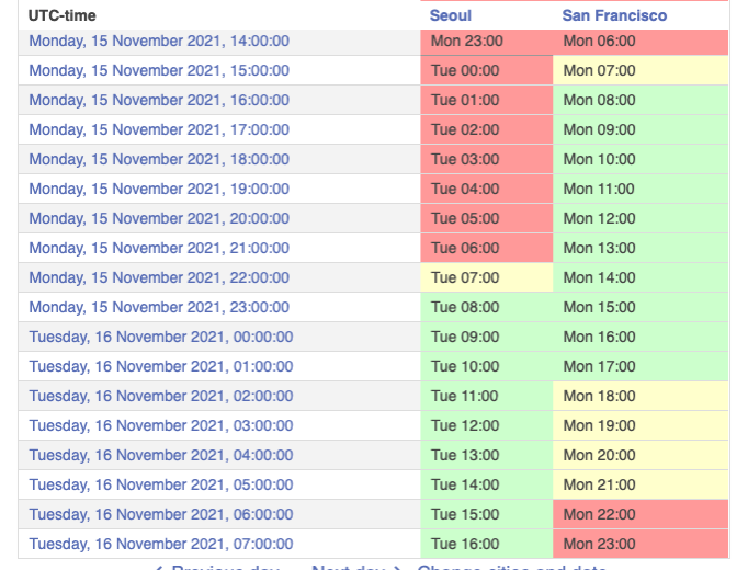 위의 이미지처럼 링크에 들어가서 원하시는 도시를 입력하시면 각 도시에게 좋은 시간대를 시각화해서 알려줍니다. 서울-샌프란시스코를 예로 보면 한국 오전 9-11시 / 샌프란시스코 14-18시가 가장 적절한 시간대로 보이네요! 시간 조율하려는 대상에게도 이런 위의 링크를 통해 각 도시의 시차를 보여주면 서로 편하게 시간을 조율할 수 있어요.