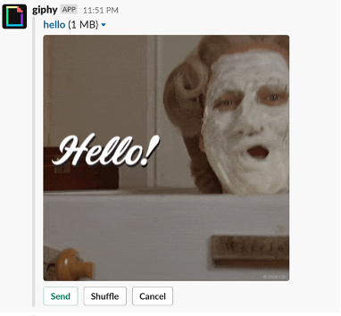 이후 엔터를 치면 다음과 같이 hello를 의미하는 움짤이 랜덤으로 뜹니다. 해당 움짤이 마음에 들면 send를 눌러 전송하시면 되고, 마음에 안드시면 shuffle을 통해 마음에 드는 것이 나올 때까지 검색할 수 있습니다.