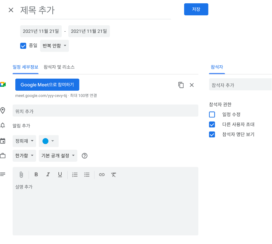 l 오피셜 미팅이 아니고 짧은 채팅 등이라면 Google Hangout을 활용하는 것도 좋습니다. 구글 행아웃은 구글에서 제공하는 화상채팅 기능인데, 구글 캘린더를 통해 미팅을 잡을 때 바로 추가할 수 있어서 Zoom 미팅보다 예약이 간편합니다. 아래 이미지에서 “Google Meet”으로 참여하기를 클릭하면 자동으로 미팅 링크가 생성됩니다.