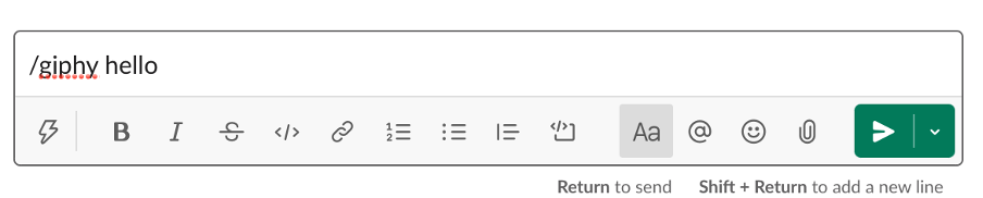 이건 그냥 슬랙을 재미 있게 쓸 수 있는 작은 기능인데으로 공유하고 싶은 작은 팁인데, /giphy 기능이라고 해서 인터넷의 움짤을 불러올 수 있는 기능입니다. “/giphy”를 입력하고 하고 싶은 말을 작성하면 여러 움짤을 불러올 수 있습니다. 예를 들어, “hello”를 쓰고 싶다면 아래와 같이 입력해줍니다.