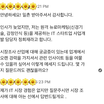 예를 들어, 스타트업에서 근무할 때 마켓 리서치 현직에서 근무하는 분의 인사이트가 필요했습니다. 이때 제가 보낸 메세지를 공유하겠습니다.