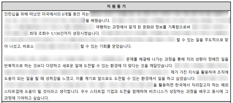 '이전에 대외활동에서 어떤 문제가 발생했는데 이때 내가 주도적으로 해결 방안을 찾아 나서서 결국에 해결을 했다. 결과적으로 우수상을 타는 결과를 얻었고 이를 통해 나의 참여가 성과로 나타날 때 성취감을 느꼈고 앞으로도 그런 환경에서 일을 하고 싶다고 생각했다. 이런 성향이 이번 프로그램에서도 스타트업들이 한국에 정착하고 발전하는데 도움이 될 것이라고 생각하여 지원했다'