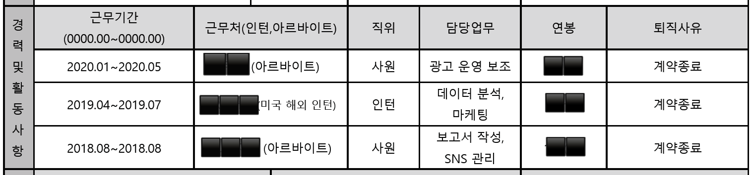 경력사항은 아마 입사지원서에 예시로 작성이 되어 있는 것으로 아는데, 줄글로 쓰지 않고 불렛 포인트로 간략하게 적어줍니다. 이력서에서 적었던 활동 및 경력 사항을 구체적으로 설명하는 부분으로, 저는 각 경험마다 4개 정도의 부가 설명을 했습니다.